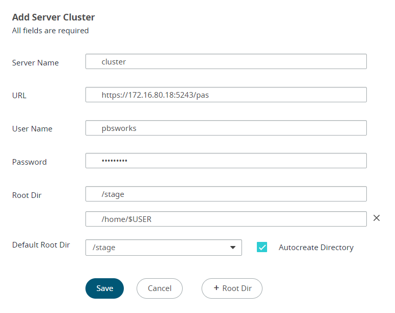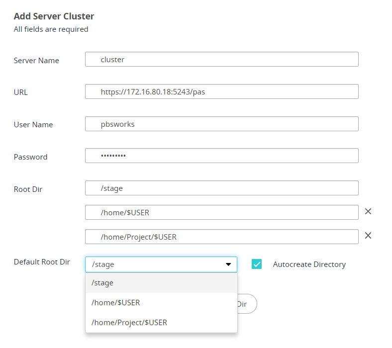 An Autocreate Directory option is provided while adding a server cluster and it is set to true. This will create the root directory specified if it is not available in PAS.