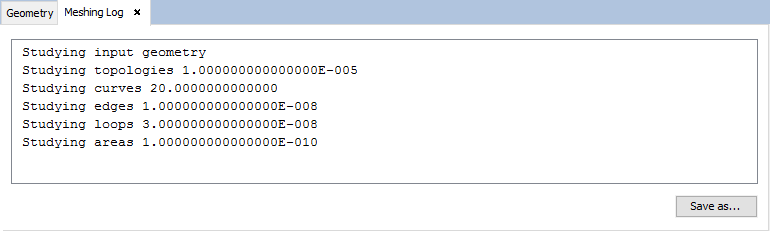 During the meshing process, information about the meshing execution is generated and displayed in the log. This information can be manually viewed later by selecting this item from the menu. A tab will display the contents of the log file, which is also saved into mesh_log.txt. Press the Save as... button to save the log to a file.