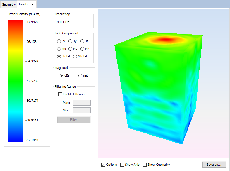 In this panel, the user can select the component of the current density that is displayed in the diagram, as well as choose the magnitude and filter the displayed values to be between a given range. The check boxes below the diagram allow the user to hide/show the left panel, show/hide the axes and show/hide the wireframe of the Insight antenna geometry. The user can also save the diagram as a PNG image file by pressing the "Save as..." button.