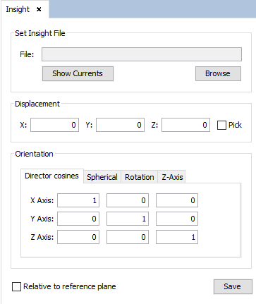 • Orientation: This parameter allows the rotation of the points of the Insight file. There are several ways the user can specify this rotation by giving each of the axis directions of the transformation, by specifying spherical rotation angles, by specifying rotation angles on each axis or by specifying the Z axis and a rotation angle.