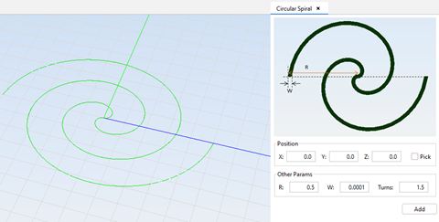 - Other Params: set the value for the radius (R), the width of the strip (w) and the number of turns (Turns). Turns can be a decimal value.