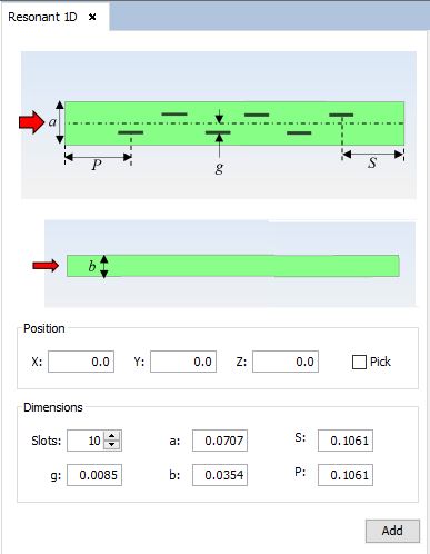 - Dimensions: set the values of the number of slots (Slots), the width and height of the feeding waveguide (a and b), the distance from the start of the waveguide to the first slot center (P), the distance from the end of the waveguide (short) to the last slot center (S) and the separation from the slot center to the broadwall center of the waveguide (g).