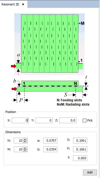 - Dimensions: Set the values of the number of radiating slots (NxM, being N the number of feeding slots and M the number of radiating slots for each resonant 1D array), the width and height of the feeding waveguide (a and b), the distance from the start of the waveguide to the first slot center (P), the distance from the end of the waveguide (short) to the last slot center (S) and the height of the feeding slots pipes (t).