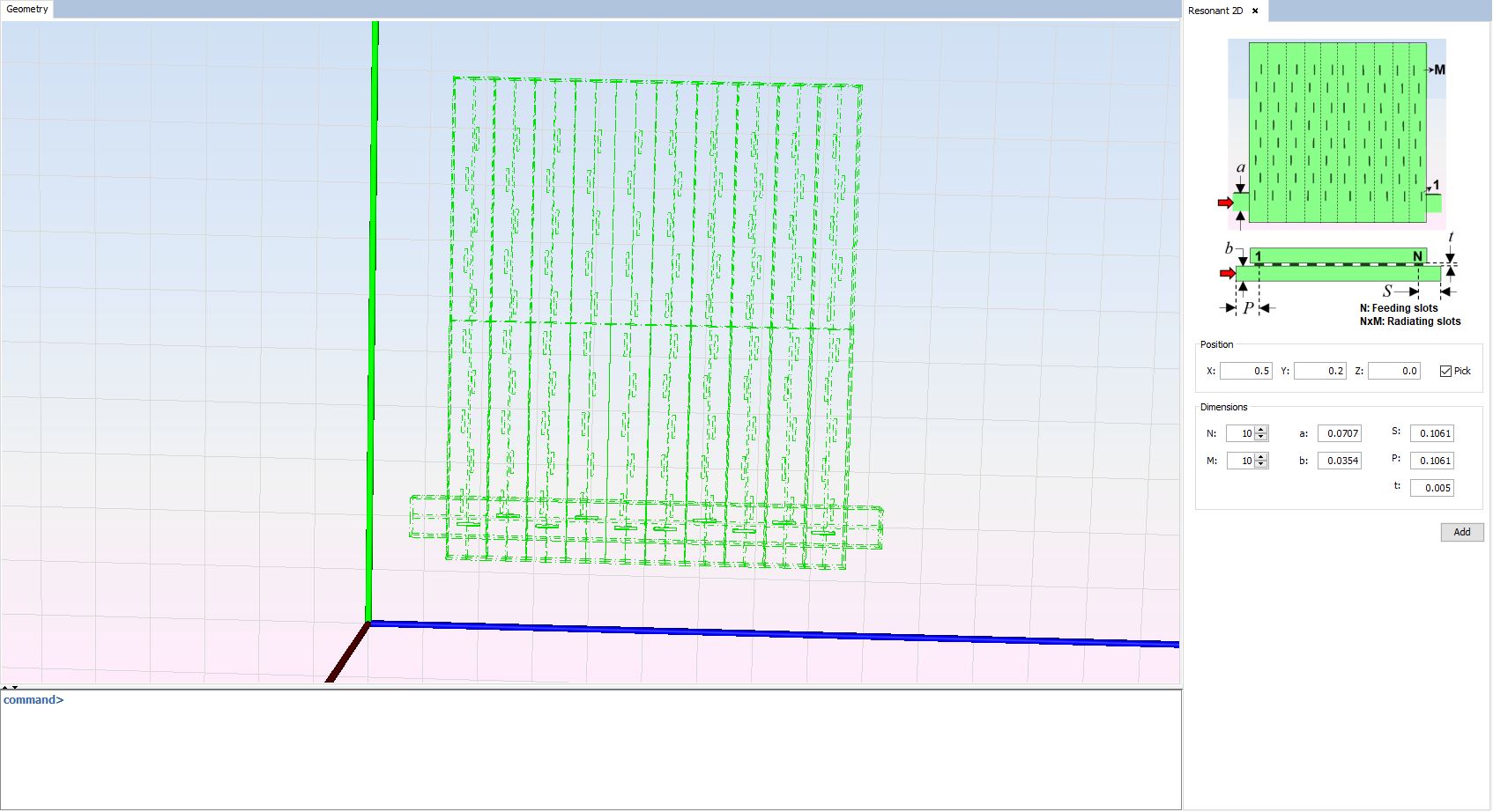 This section explains how to create a resonant slot planar (2D) array antenna, where a feeding rectangular waveguide excites an array of resonant linear (1D) array antennas.
