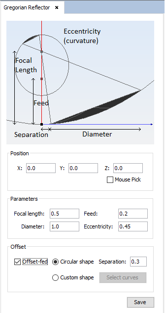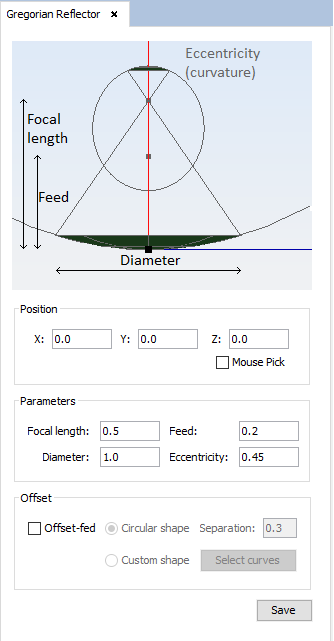 In order to actually create the geometry of the Gregorian reflector system, the user needs to press the "Save" button.