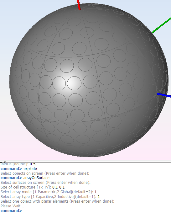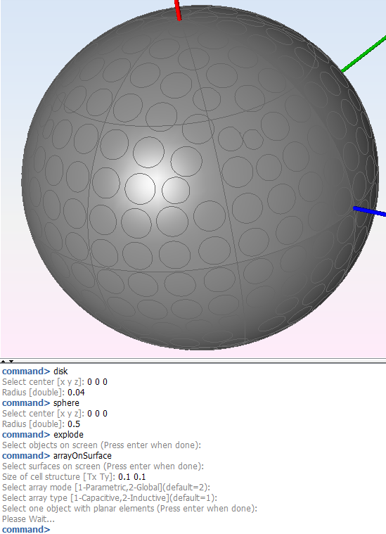 The next figure shows the full example of the disk array on the sphere with all the parameters required by default (the original objects have not been deleted).