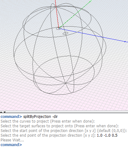 - splitByProjection -s <nameCurve1> <nameCurve2> ... –targets <nameSurface1> <nameSurface2> ... -dir <startX> <startY> <start> <endX> <endY> <endZ>