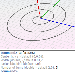 - surfaceSpiral -n <name> -p <center_x> <center_y> <center_z> <width> <radius> <numberTurns>: Creates left-turned spiral named <name>, with center at (center_x, center_y, center_z), and the given width, radius and numberTurns turns.