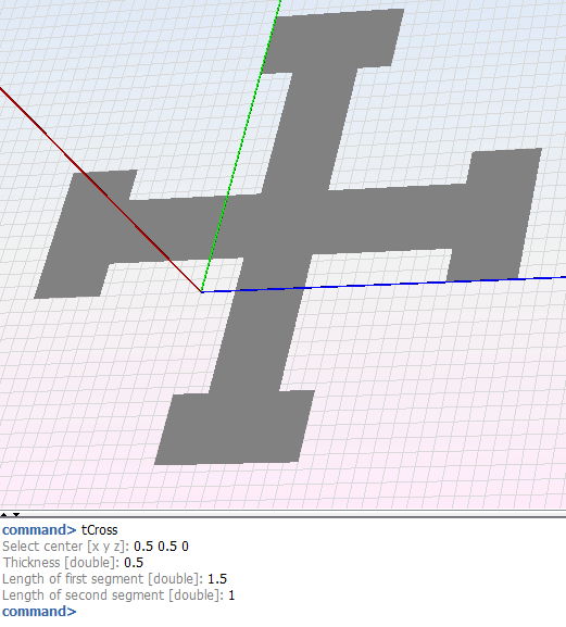 - tCross -n name -p x y z thickness firstSegmentLength secondSegmentLength: Create a new T Cross.