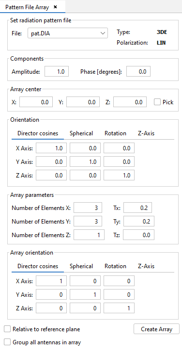 In this panel, the user can specify the parameters of each pattern file in the same way as in the "Pattern File Antenna" panel (as described in the previous section). Additionally, the user can specify parameters regarding the creation of the array: