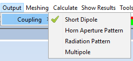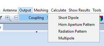 The Coupling submenu is available under the Output menu when the current simulation is a Coupling or MIMO simulation. This menu allows the user to configure the passive antennas of the simulation by adding individual antennas or creating arrays of passive antennas. The available options under the Coupling submenu are shown in the following figure: