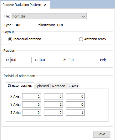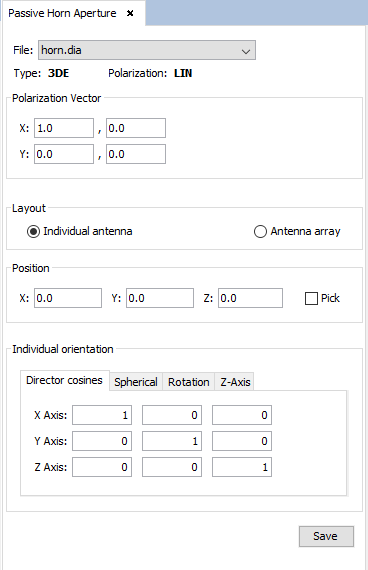 In this panel, the user needs to select the DIA (radiation pattern) file to be used for the antenna feeding and set its polarization vector (given by the real and imaginary parts along each coordinate). When the user selects a DIA file, the type and polarization of the radiation pattern file will be shown.