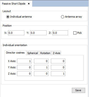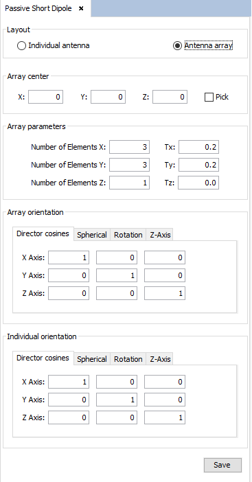 The user is able to select whether they want to add an individual short dipole or an array of short dipoles. In the first case, the user needs only to specify its location and orientation. In the second case, however, the user will need to specify the following parameters: