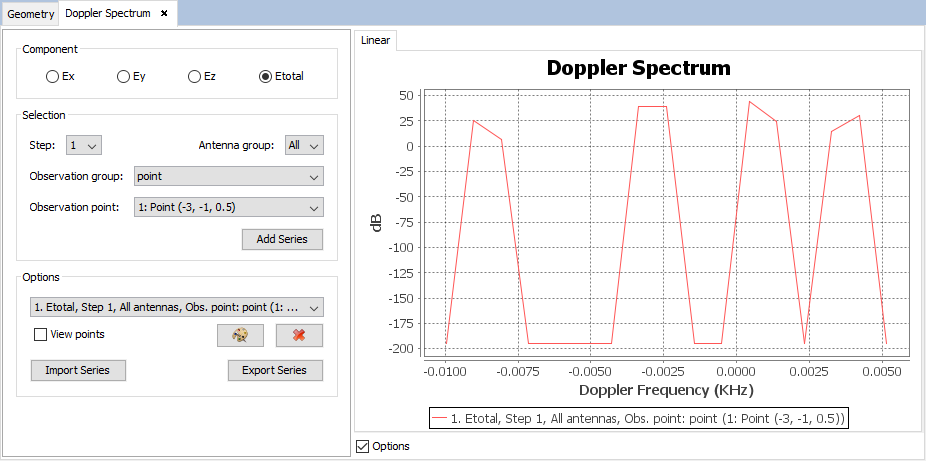 This command plots the Doppler frequency shift computed. Several cuts and frequencies can be plotted in the same graphic. To plot a graph, the user can select the field component, step, antenna and observation point. A new graph will be plotted with the button ' Add Series'. In the case that the user has set up a parametrized geometry, it is possible to select the step to visualize the results for.