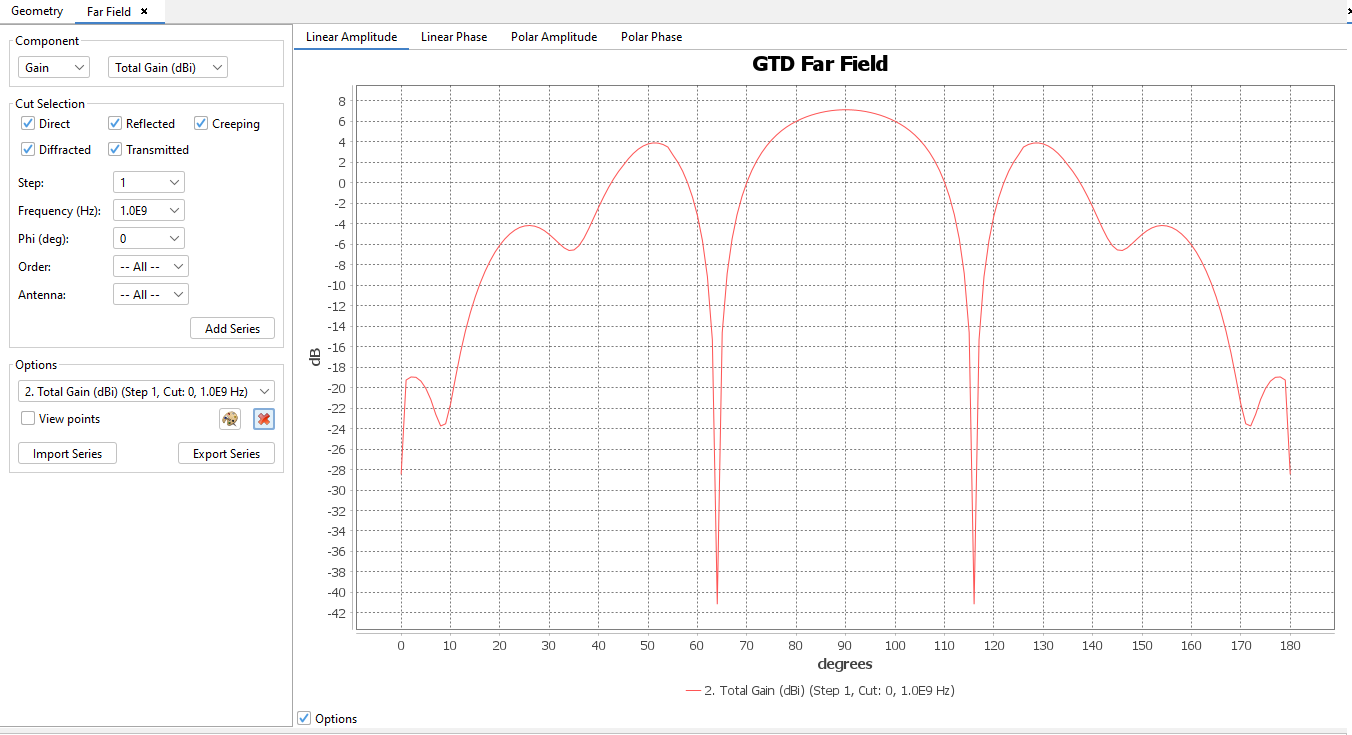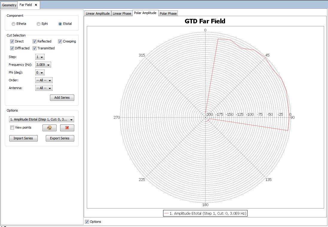 This command plots the amplitude and phase of the far field computed for each angular cut of the simulation geometry. Several cuts and frequencies can be plotted in the same graphic considering different effects and antennas. To plot a graph, the user can select the field component, the frequency, the step, the cut, the order and the antenna. A new graph will be plotted with the button Add Series. In the case that the user has set up a parametrized geometry, it is possible to select the step to visualize the results for.