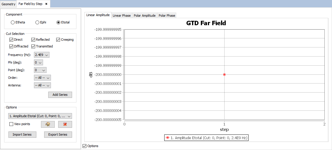 When initially open, the panel will display a default series in the plot that will represent the measurements for a particular component, frequency, order, antenna, and observation point, against every possible step that has been simulated. More series can be added, by selecting component, frequency, order, antenna and spherical coordinates in the control panel that appears on the left side of the plot.