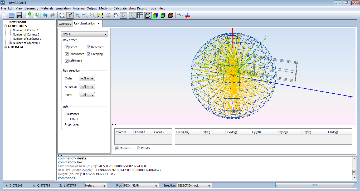 This command plots the rays emitted by the active antennas in the simulation only if the check box Output Ray-Tracing in the Simulation panel has been selected.