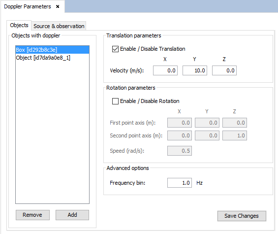 In the "Objects" tab, the user can add Doppler effect to objects in the geometry. To do this, select an object from the geometry view and press the Add button. The selected object will be added to the "Objects with doppler" list. It is possible to remove the Doppler effect from an object by selecting it from the list and pressing the Remove button.