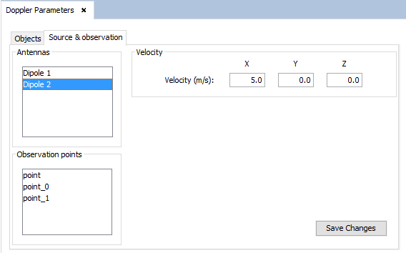 In the "Source & Observation" tab, the user can set Doppler velocities to individual antennas and observation points. To do this, the user should select an item from the "Antennas" or the "Observation points" lists and fill the Velocity textboxes with the desired velocity. It is possible to select multiple antennas or observation points by holding the Ctrl key and clicking on each antenna or observation point.