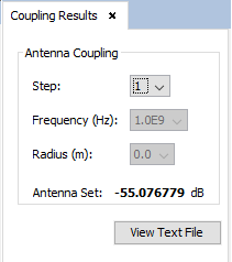 This option allows the user to inspect the coupling values at each step, at a given frequency and a given observation point. The coupling value will be shown next to the "Antenna Set" label in dB.