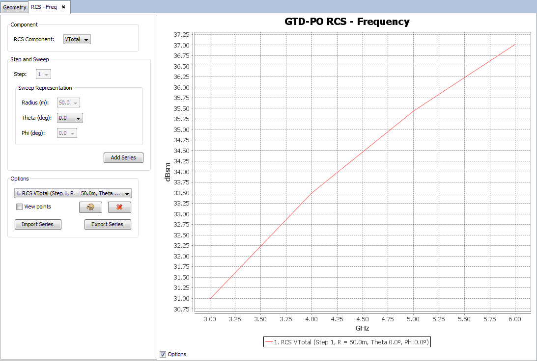 When initially open, the panel will display a default series in the plot that will represent the measurements for a particular component, step, and radius, theta or phi, against every possible frequency that has been simulated. More series can be added, by selecting component, step and sweep representation information in the control panel that appears left-side to the plot.