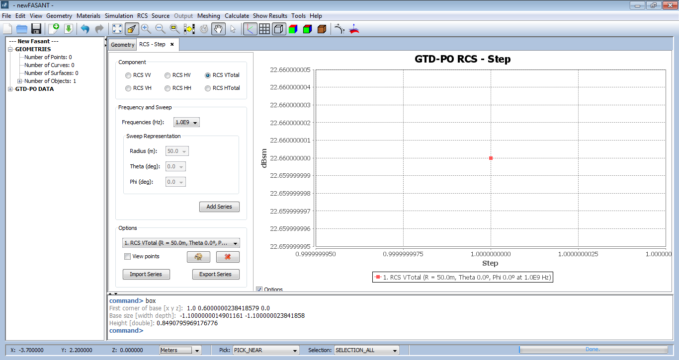 This kind of plot lets the user analyze RCS measurements made by the simulation provess for a particular component, frequency and observation point against the parametric steps defined in the project. This option is useful when the user has parametrized a simulation by adding parameters and making objects such as geometries depend on the parameters themselves.