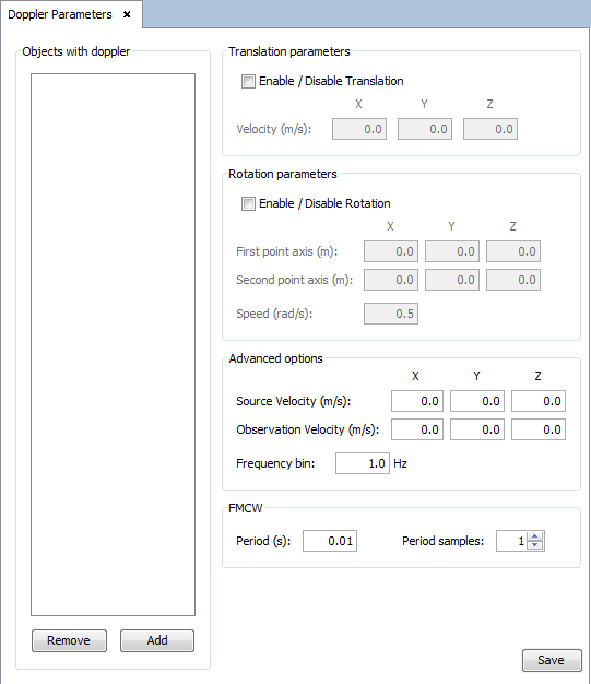 In this panel, we can add Doppler Effect to objects in the geometry. To do this, select an object from the geometry view and press the Add button. The selected object will be added to the list of objects. It is possible to remove the Doppler Effect from an object by selecting it from the list and pressing the Remove button.