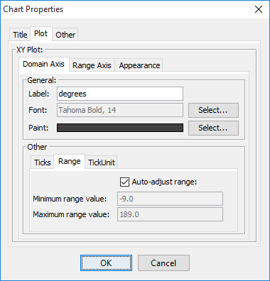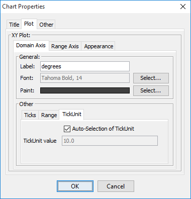 - TickUnit value. This option allows the user to configure the value for the interval between two consecutive ticks. This option is only enabled if the "Auto-selection of TickUnit" check box is not selected.