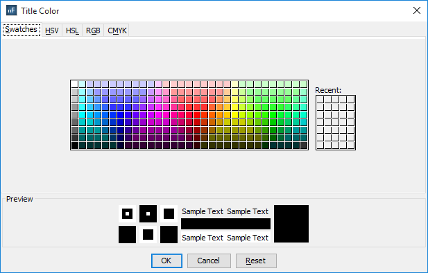- Paint. This option allows the user to configure the font color. The text field shows the current color and "Select..." button displays a panel to select a new color. The panel that appears is the same as the 'Font' option explained on 'Title' tab.
