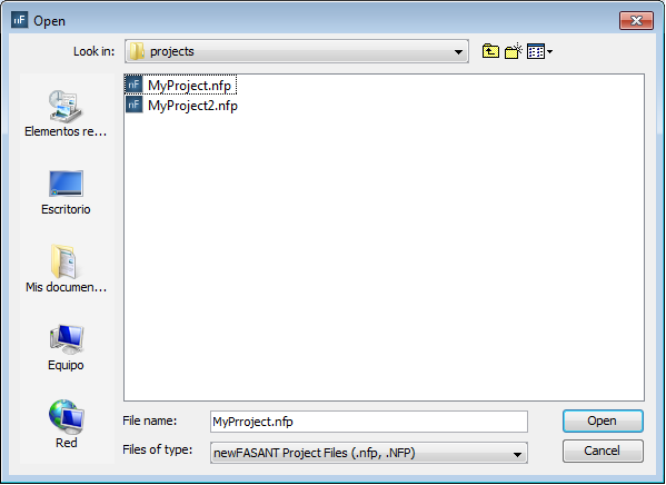 This option allows the user to open an existing newFASANT project (.nfp file extension). A dialog asking whether the user wants to save the previous working project will be prompted.