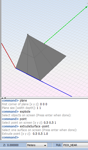 • To point: This option allows the user to create a solid object by connecting all points of the surface to a single point. The parameters needed for this operation are the surface to extrude and the point.