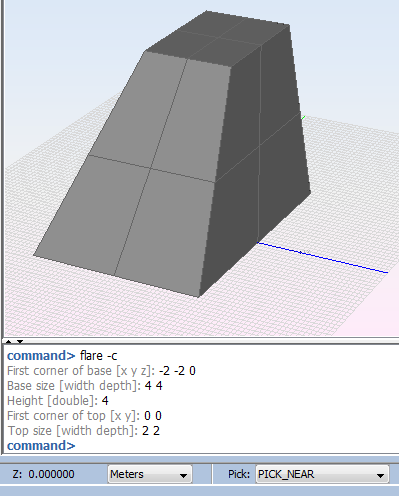 This option allows the user to create a trapezoidal prism. This function receives the following parameters two corner points of the base (these must be in the same diagonal), the height and two corner points of the top base (again, in the same diagonal).