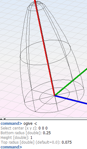 A tangent ogive with the same parameters than the spherically blunted is shown in figure below. Note that the height of the generated ogive only agrees with the specified one when the top radius is set to 0 (tangent ogive), otherwise the ogive is shorter (spherically blunted-tangent ogive).