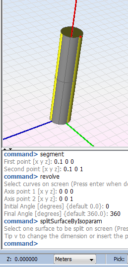 This option is useful when a surface need to by split in a given isoparametric curve. This operation may be used to separate surfaces with extreme curvatures in different parts. Tip u or v to change between the two parametric dimensions of the surface. Then, the point is specified as a parametric coordinate (between 0 and 1), and the pick mouse functions may be useful to split the surface close to any desired point.