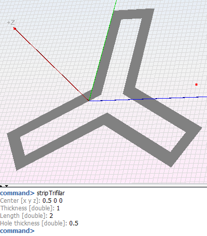 This option allows the user to create a hollow trifilar surface. The parameters needed for the creation of a strip trifilar are the central point of the trifilar, the thickness of the (equivalent, not hollow) trifilar, the length of the segments and the thickness of the hole of the trifilar.