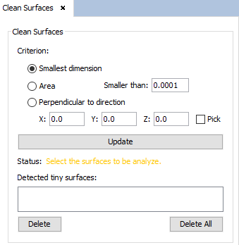 • Click on Delete button to remove the surfaces selected within the Detected tiny surfaces list.