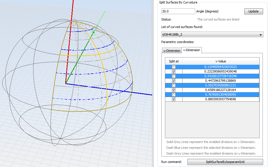 Click on SplitSurfaceByIsoparamGrid button to finish the example by dividing the surface with the enabled parametric coordinates. After run the command, the list of curved surfaces is updated and the first one is selected, as shown in next figure.