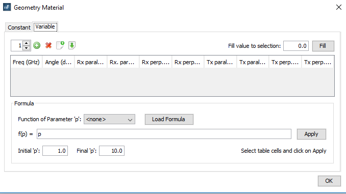 § Frequency (in GHz): Sets the associated frequency to the physical properties. The frequency values for each material are interpolated when the simulation is launched in order to use the most suitable one for the working frequency.