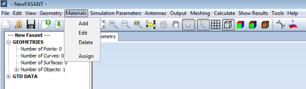 In this section all the features available in the GTD (Geometrical Theory of Diffraction) module Materials menu are explained. The available options in the Materials menu are shown in the next Figure.