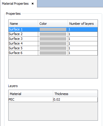 This option displays the material assigned to different surfaces. The first table shows the selected surfaces, the color of the assigned material and the number of layers. The second table shows the selected surface of the first table with the materials of each layer. This options is only available in GTD module.