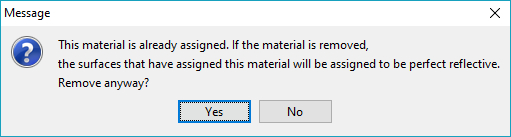 If the user selects "Yes", the material will be deleted and the surfaces that had the material assigned will be assigned a perfect reflective material instead. If the user selects "No", the material won't be deleted and no action will be performed.