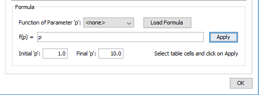 This option serves for completing the selected cells of the table with values depending on the selected function. After choosing the function that we want to apply, pressing the Load Formula button will load the formula f(p) in the field. The next step is choosing the initial and the final value for the function. The final step is selecting the cells that we want to apply the function to and press the button Apply. The cells will be auto-completed with the values created by the chosen function starting with the initial value and ending with the final one.