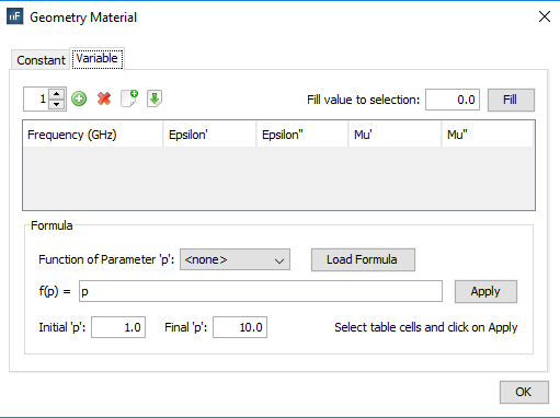 § Frequency (in GHz): Sets the associated frequency to the physical properties. The frequency values for each material are interpolated when the simulation is launched in order to use the most suitable one for the working frequency.