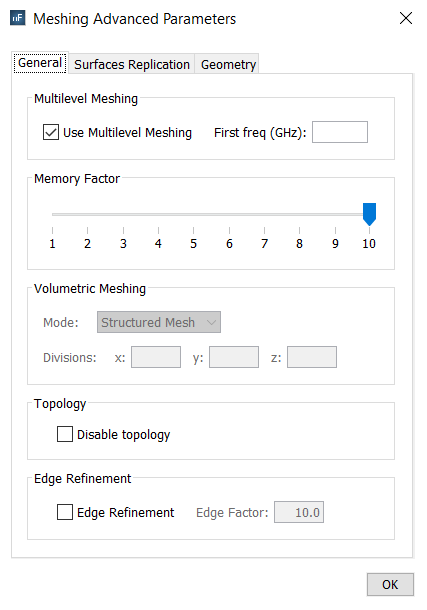 - Memory Factor This option allows a reduction of the memory resources required in the mesh generation process. The memory allocation is an automatic feature in this process, so the highest one is selected by default to ensure that the mesh will be successfully obtained. If the memory resources exceed the available memory, the message "ERROR Not enough memory. Please, try decreasing Memory Factor" will appear to suggest decreasing this factor. Sometimes, a short factor may lead in not enough allocation for the required mesh resolution.