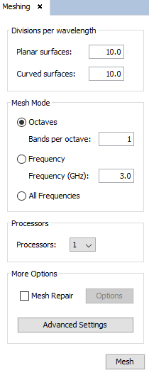 • Divisions per wavelength This section specifies the size of the elements to be generated in the meshing process. Let c be the speed of light in the vacuum (meters per second), given a number of divisions D and a frequency f, the size of the generated elements L is given by: L = lambda / D ; lambda = c / f The larger is the number of divisions specified the denser are the generated meshes. Different meshing resolution is considered for planar and curved surfaces. Also, a specific number of divisions may be assigned to different used by using the Specify Divisions option within the Advanced Options section.