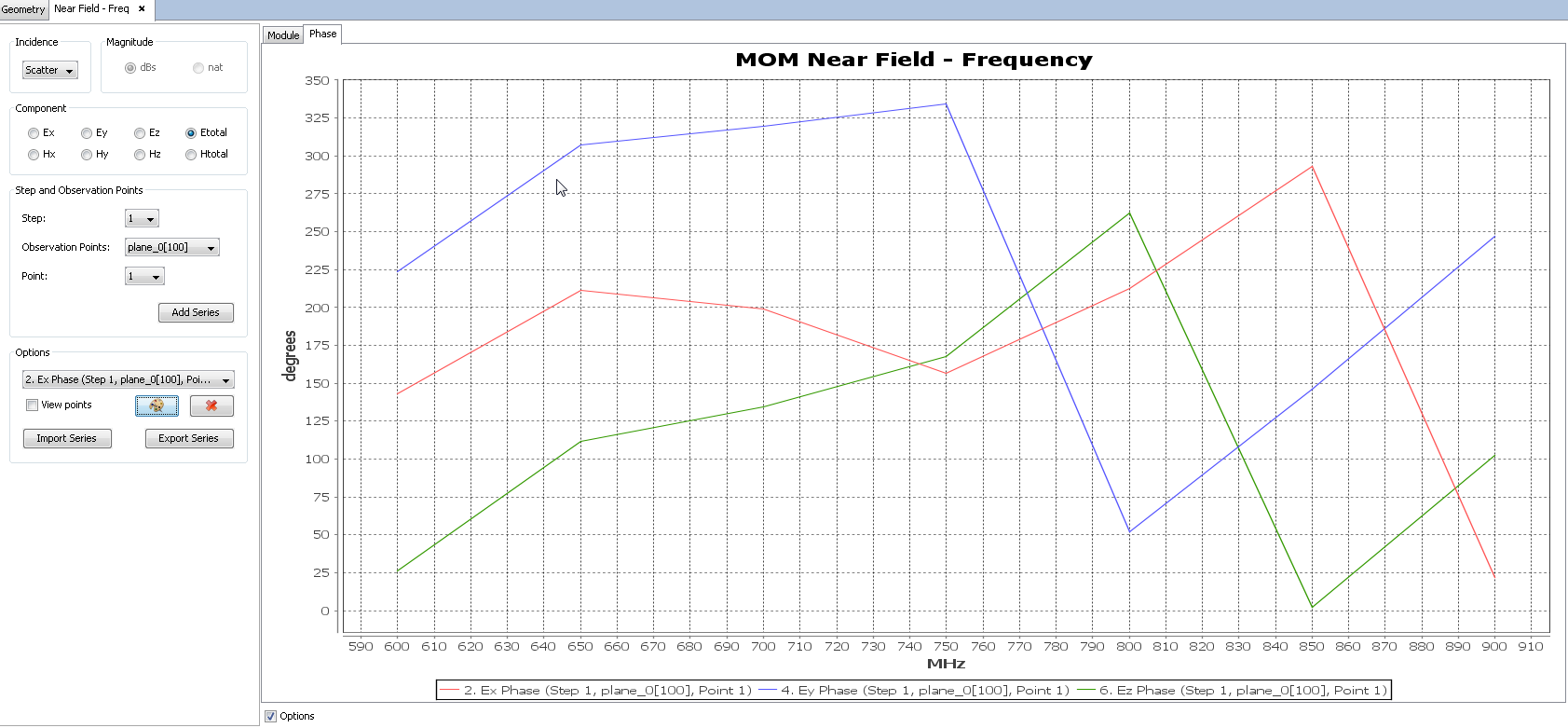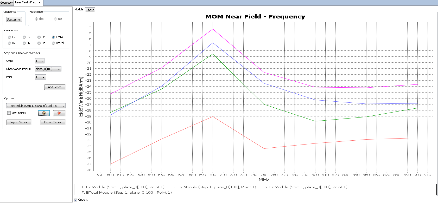 - List of Series All the plotted field components are listed. Note that two options are included for every plot for most of components both the amplitude and the phase. However, ETotal and HTotal only represent the module.