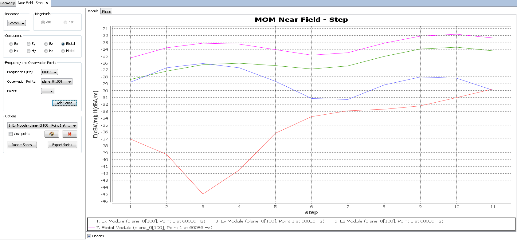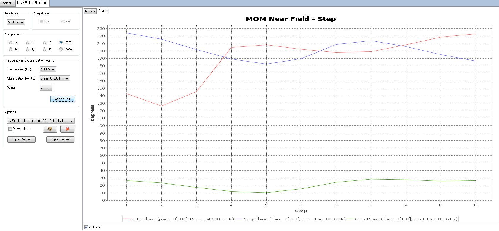 • List of Series All the plotted field components are listed. Note that two options are included for every plot for most of components both the amplitude and the phase. However, ETotal and HTotal only represent the module.