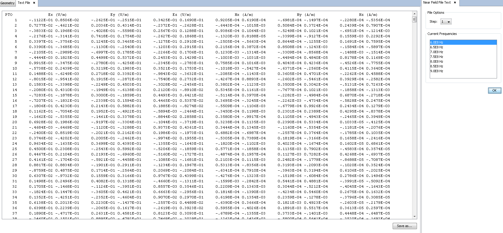 Figure 1. Viewing near field values in text format