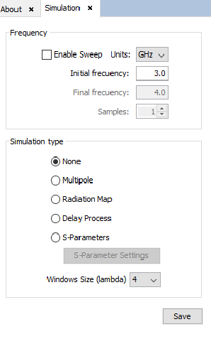 The Window Size (lambda) parameter specifies the number of lambdas which defines the size edge of the generated regions in multipoles output files. This option only may be modified when a Multipole or Radiation Map simulation types are selected.