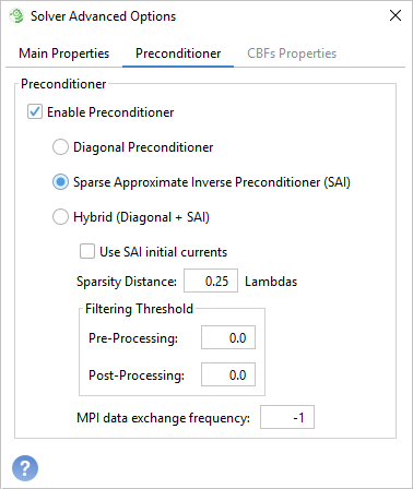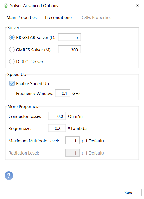• Post-Processing: This parameter controls the amount of data to be stored after the generation of the preconditioner. Lower values entail better convergence, while higher values entail less RAM required to store the preconditioner.